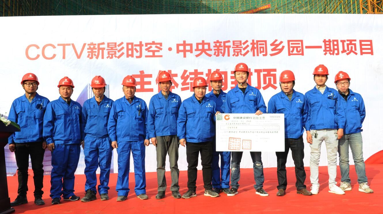 CCTV新影時空·中央新影桐鄉園一期項目總建筑面積54000M2(其中地上40000M2、地下14000 M2),地下1層,地上13層。項目于2015年12月31日項目奠基,施工過程中,項目部全力以赴,克服重重困難,保安全、重質量、搶進度,在各方主體的支持、監管和全體施工人員的共同努力下,于2016年10月30日提前完成地下室頂板澆筑,2017年1月20日又比預定目標提前4天完成主體結構封頂,高速、高效得完成主體施工任務,得到了各級領導的充分肯定和建設單位的高度認可。儀式上,項目部當即受到了建設單位100萬元的嘉獎。