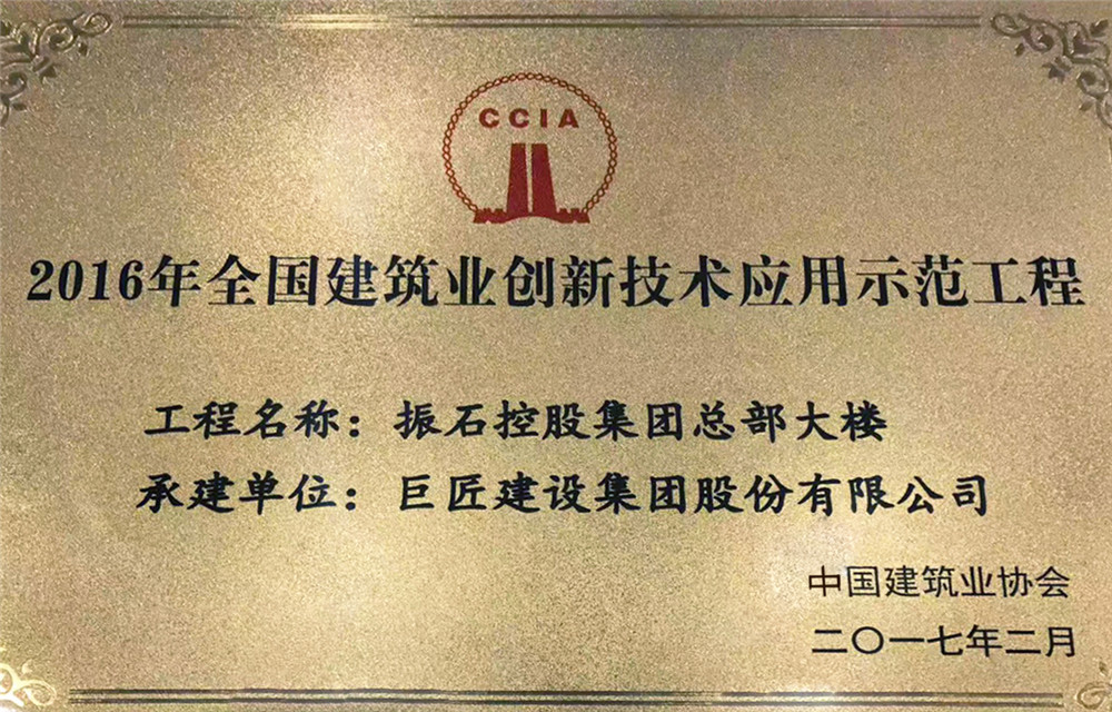 集團振石總部大樓項目榮獲“2016年度全國建筑業創新技術應用示范工程”